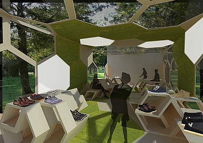 Dieser Store ist eine kurzzeitig einsetzbare Konstruktion für Parks in Großstädten. Der VIVO pop up Store ist eine Konstruktion aus Hexagonen, als Anspielung auf die Waben-Schuhsohlen und das Firmenlogo.