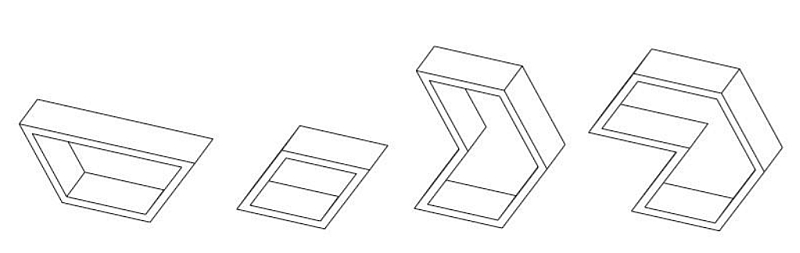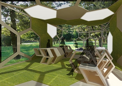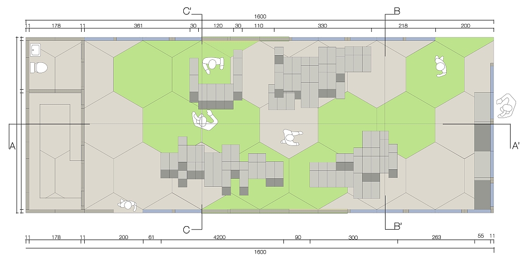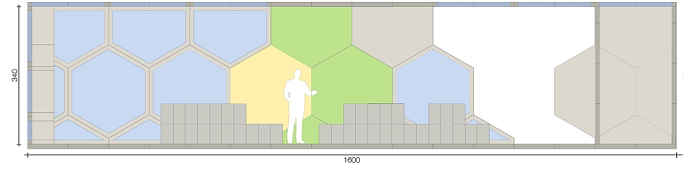 Die Möbelstücke sind aus vier Modulen zusammengestellt, die aus Fragmenten der Hexagon Form gebildet worden sind.
