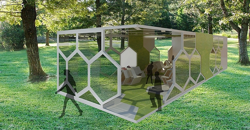 Die Hauptelemente sind aus Sperrholz und Plexiglas. Die großen Plexiglas wände dienen als Hauptlichtquelle, durch die das Sonnenlicht ungehindert einfällt. Zusätzlich geben sie dem Käufer das Gefühl, in einem Innenraum mit der Natur verbunden zu sein, was zudem durch einen Naturrasen, der durch das Innere der Ladenkonstruktion nach außen führt, verstärkt wird.