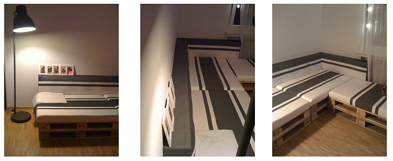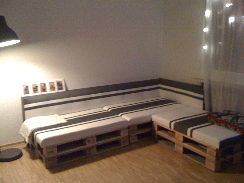 Ein Sofa aus alten Euro Paletten mit gepolsterten Auflagen. Die Rückwand/Rückenlehne ist gepolstert und etwas breiter als zusätzliche Ablagefläche für Fernbedienung oder Getränke.
