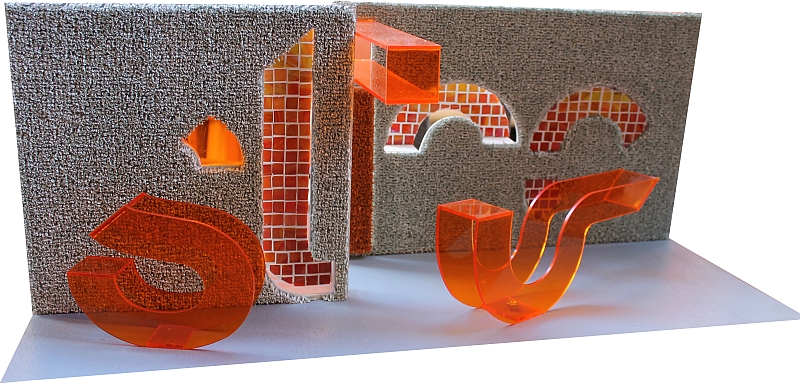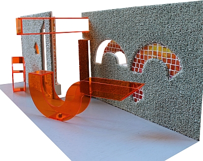 Von dem Firmenlogo ausgehend, entwickelte ich eine dreidimensionale Ausstellungswand, die slice durch das Konzept des schneidens repräsentiert.