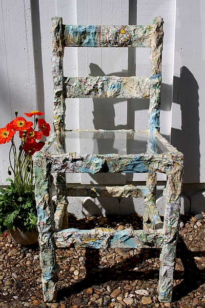 einem Sänger aus Köln, Deutschland, habe ich die Zeile: „ It´s not about class, colour or races, let´s get around and see different places“ herausgenommen und auf den Stuhl übertagen, um ihm ein neue Persönlichkeit zu geben. „It´s not about class, colour or races“ wird durch die transparente Sitzfläche repräsentiert. „Let´s go around and see different places“ wird durch verschiedene Landkarten auf dem Stuhlrahmen, die durch die Klebetechnik mit Höhen und Tiefen die Topographie der Landschaften imitieren, ausgedeutet.